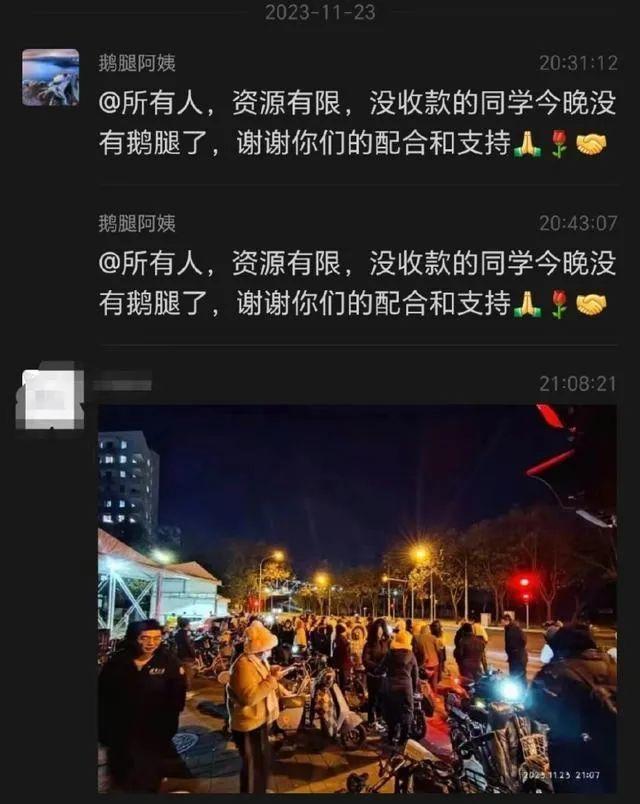 “资源有限,没收款的同学今晚没有鹅腿了,谢谢你们的配合和支持。”预订结束后,阿姨在群里发布的消息,又引得许多没抢上的学生“哀嚎一片”。“鹅腿阿姨”说,北大和人大群里天天有孩子问,什么时候能吃上烤鹅腿,不能光在清华卖,每个学校都得轮流去几天。
