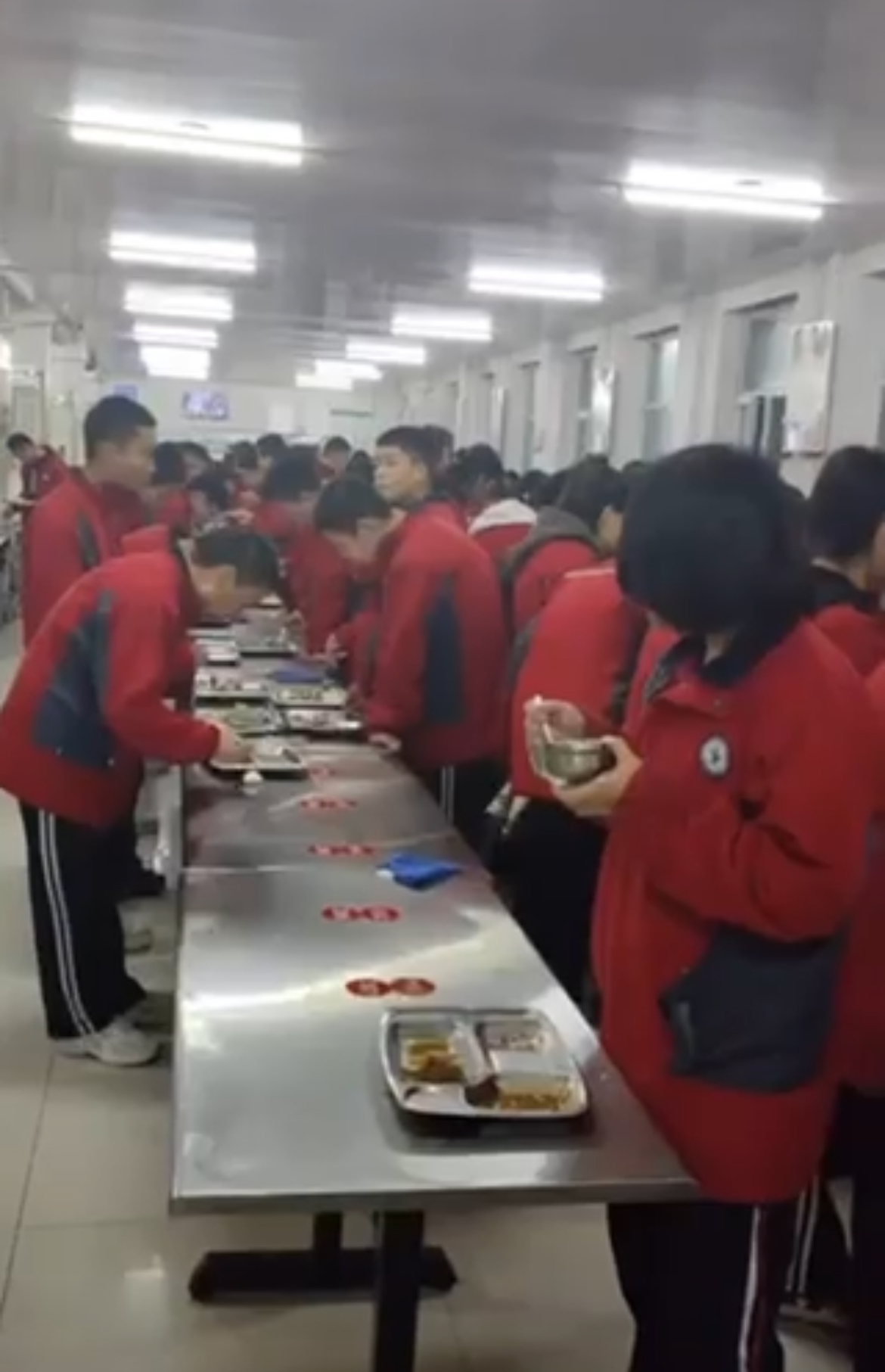 网传视频显示,众多身穿校服的学生,有秩序地站在学校食堂里的餐桌前吃饭,餐桌旁未见有椅子。