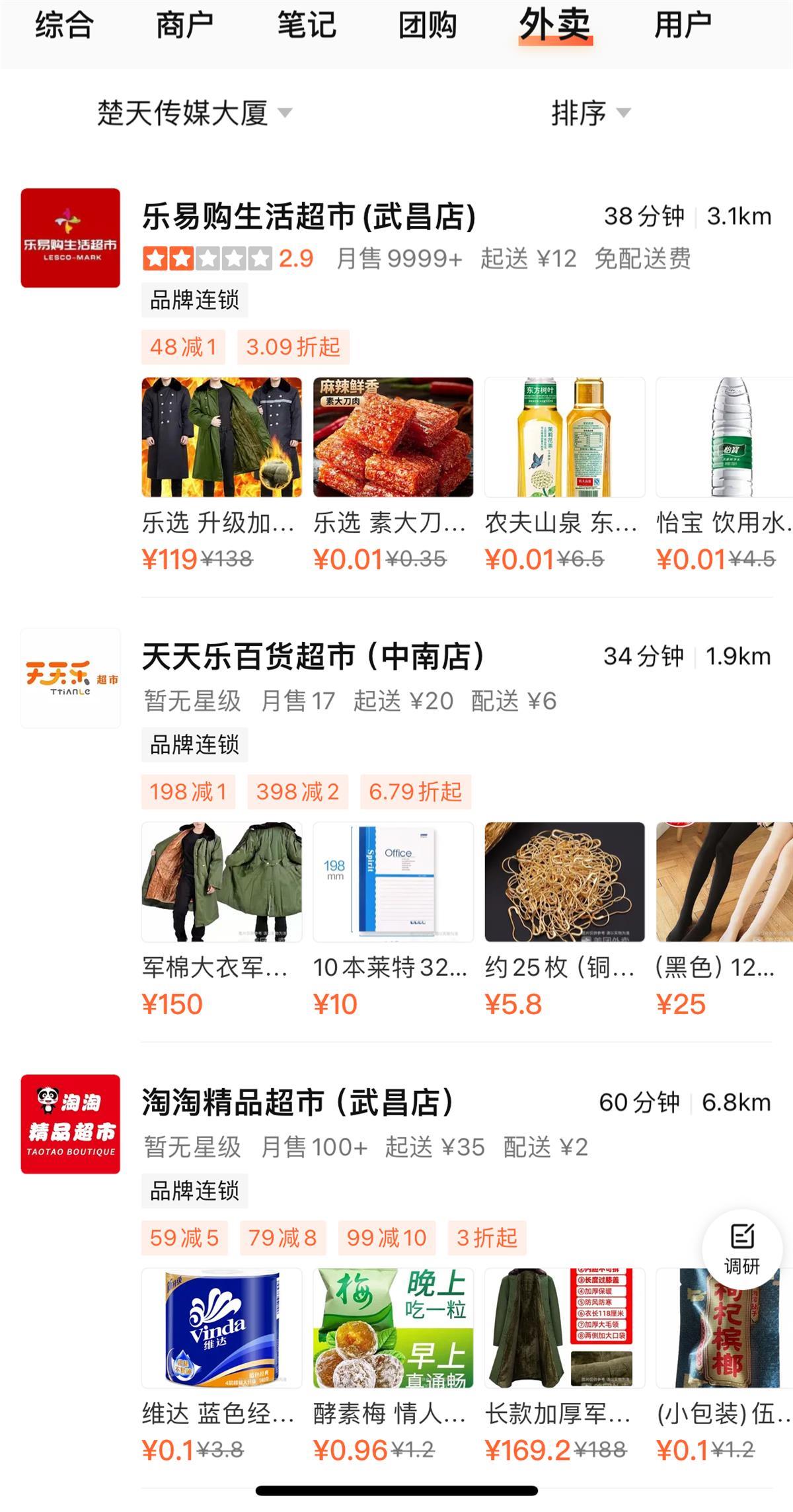 11月30日,极目新闻记者定位武汉东湖路,搜索周边超市发现,不少超市在售军大衣。
