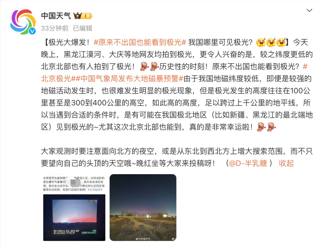 今天晚上,黑龙江漠河、大庆等地网友均拍到极光,更令人兴奋的是,较之纬度更低的北京北部也有人拍到了极光!历史性的时刻!原来不出国也能看到极光?
