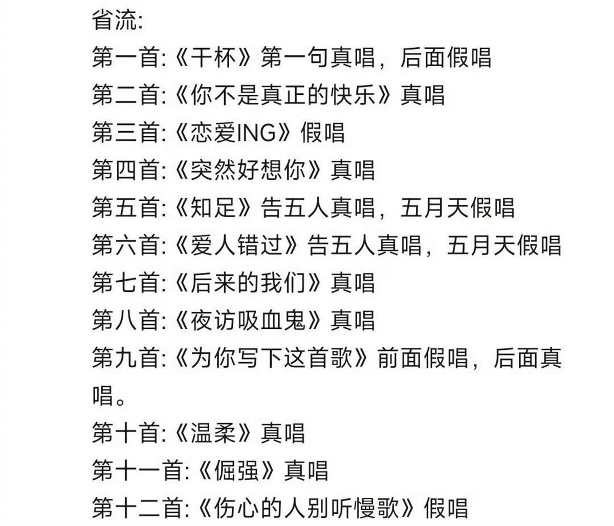 通过逐首拉帧分析,“麦田农夫”得出结论称,11月16日上海演唱会粉丝提供的这12首歌中,《干杯》《恋爱ing》《伤心的人别听慢歌》几乎整首“假唱”;五月天与告五人合作的《知足》《爱人错过》两首歌,告五人“真唱”,阿信“(音准)非常的准”“假唱”;《为你写下这首歌》“前面假唱后面变真唱”;《你不是真正的快乐》《突然好想你》“(音准)基本都不准……(有)非常多的瑕疵”,确定为“真唱”……