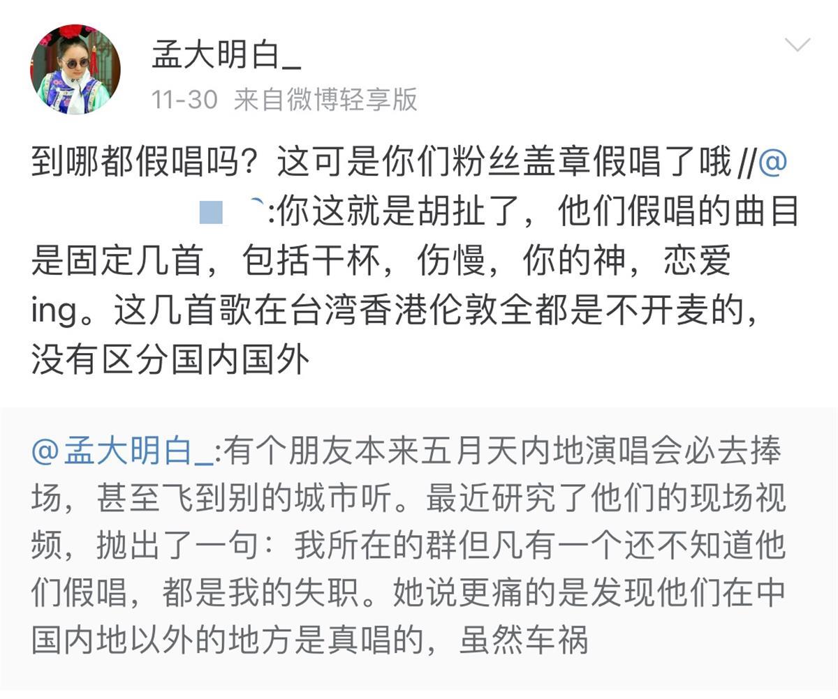 极目新闻记者在连续观察此事时发现,跟其他明星“有事”时一样,五月天的部分歌迷也极力在微博广场否认偶像假唱,但另一方面,不少歌迷又似乎早已默许了“假唱”的合理存在。