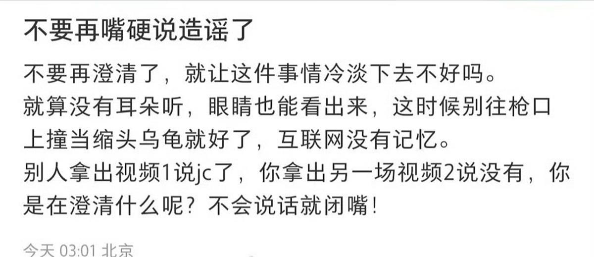 同时,也有粉丝在事件发酵前于社交媒体发声,要求粉丝、歌迷不要再在社交平台澄清甚至辱骂鉴定博主,“这个事粉丝最好就是冷处理,别看别管”“不要再嘴硬说(假唱是)造谣了……让这件事情冷淡下去不好吗?互联网没有记忆……别人拿出视频1说假唱了,你拿出另一场视频2说没有,你是在澄清什么呢?不会说话就闭嘴!”