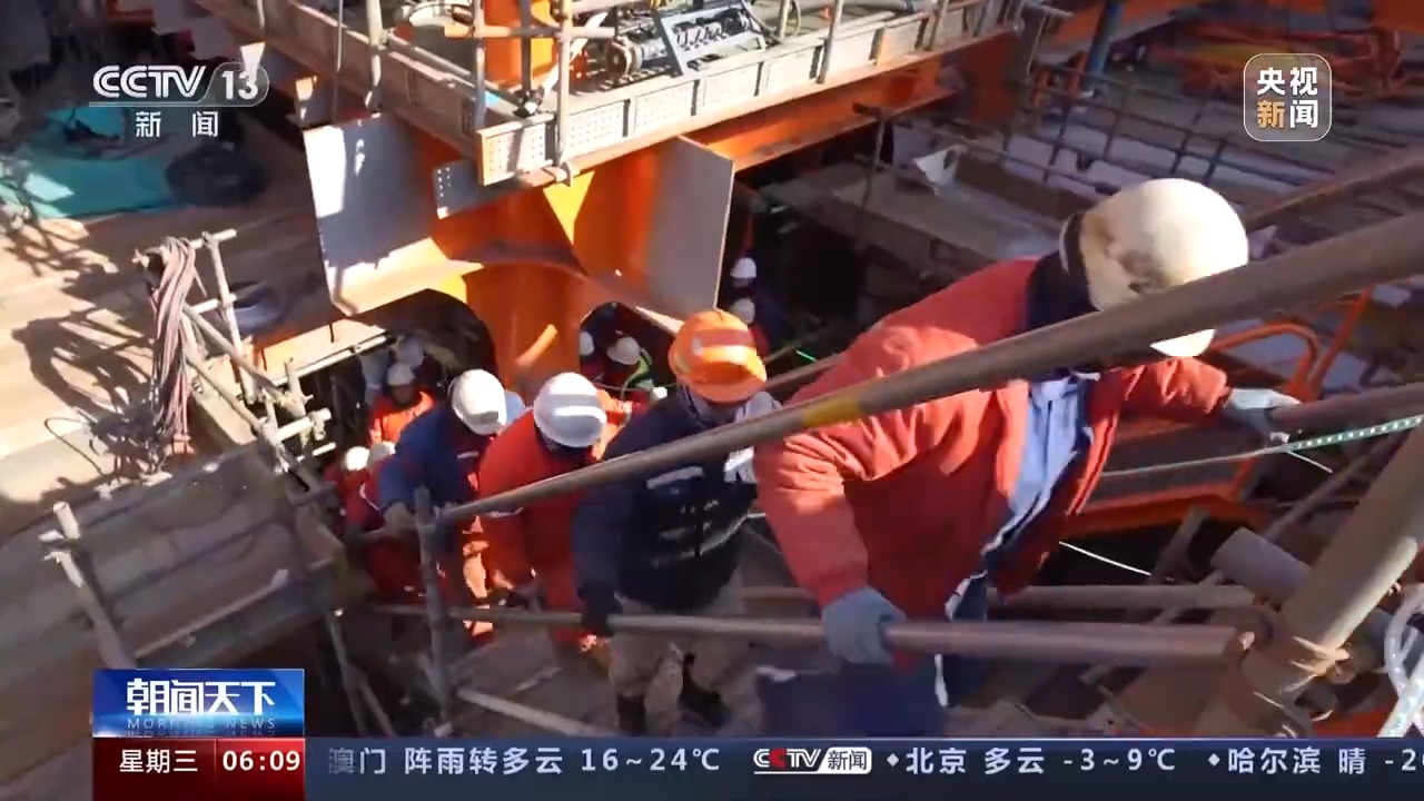 总台央视记者 张丛婧:走进能源碗,我发现这里遍布着钢铁立柱。通过航拍画面可以看到,这上面堆满了不同大小和形状的立方体,它们被叫做“功能模块”,是能源碗的核心装置,承担着油气处理、生活办公等不同任务。工作人员告诉我,要组装这些模块,其实就像搭积木一样,是一整块地吊装上来,而每个模块都重达一千多吨,要从近百米的高空精准下放,而组装间隙只有不到十厘米,还不能有任何擦碰,这个难度可想而知。我现在是在两个模块的对接处,您看,安好之后这两个之间的缝隙,还没有我的手掌宽。