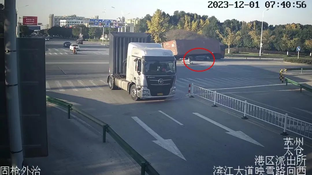 监控视频显示,12月1日7时40分许,在一个十字路口处,一辆红色集装箱货车在经过路口时,剐蹭到对向驶来的另一辆集装箱货车上,导致车箱侧翻,车箱完全压住了一辆小轿车。