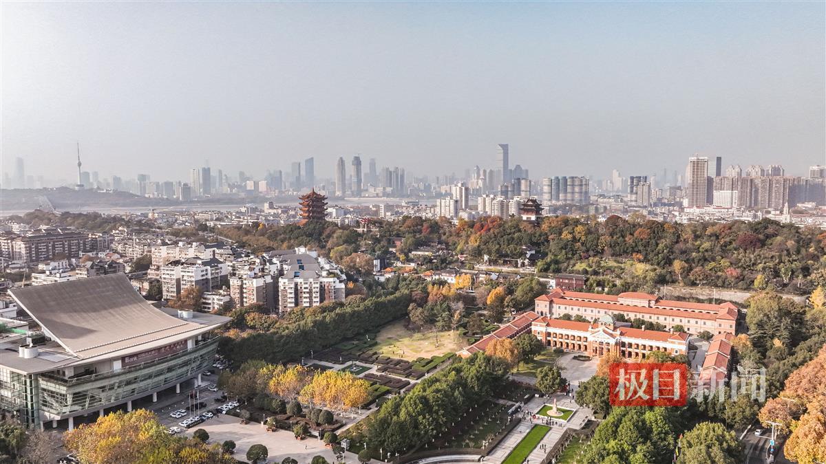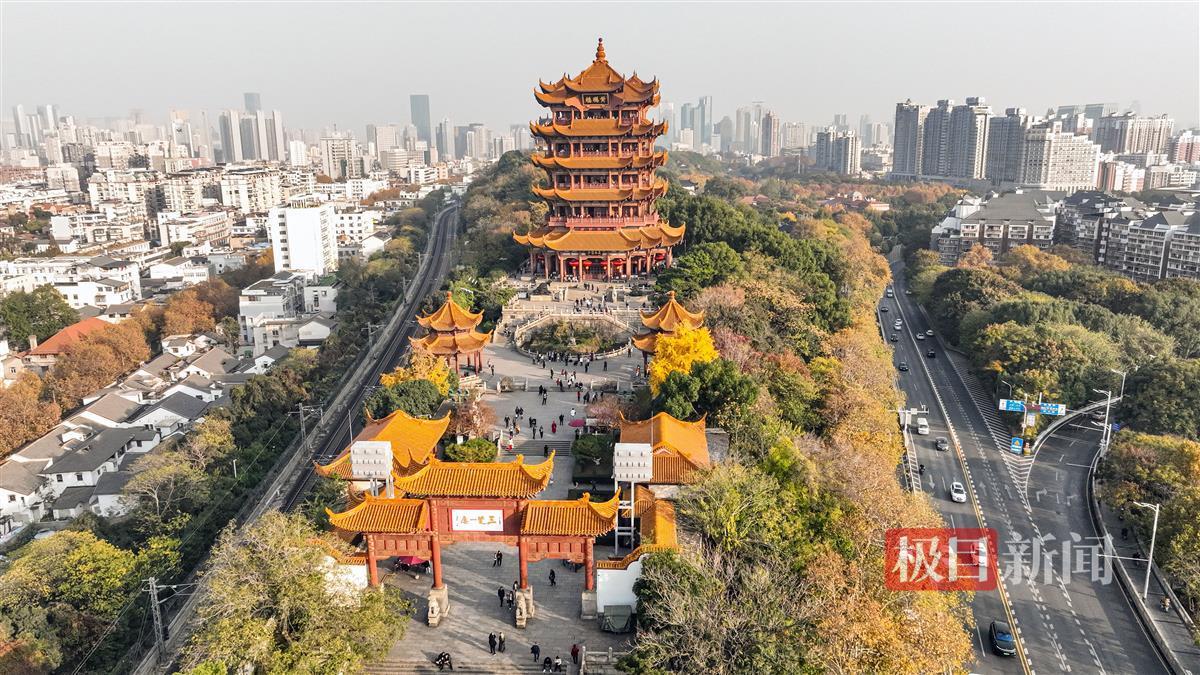 借助无人机从高空鸟瞰,武汉黄鹤楼及它所处的蛇山,散发着色彩斑斓的神韵。秋冬时节,俯瞰黄鹤楼公园,尽是五彩缤纷。