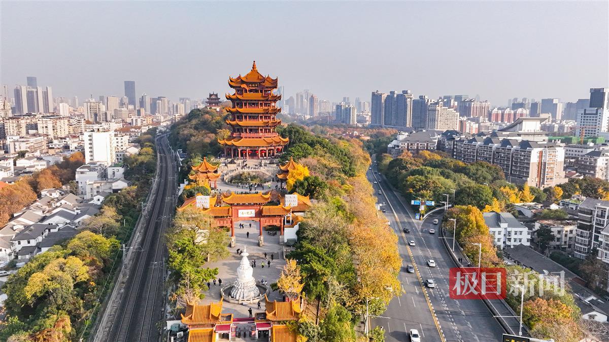 秋冬时节,红叶飘扬,银杏飞洒。12月6日,暖阳穿云而过,把温柔明媚的阳光洒在黄鹤楼上,洒在蜿蜒的蛇山上。