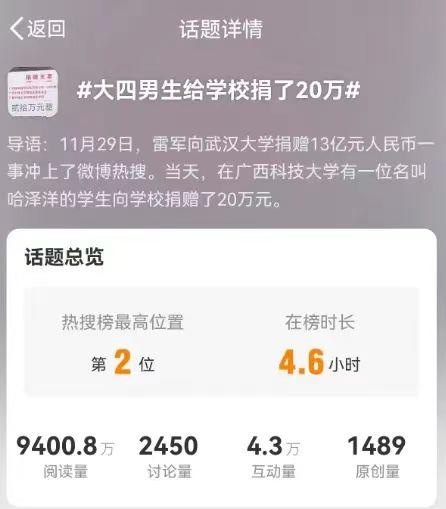 事实上,早在11月29日,哈泽洋向母校捐赠的仪式就已经简单举行过。当地媒体报道后,“大四男生给学校捐了20万”的新闻也紧随“雷军向武大捐赠13亿元”上了热搜,引起媒体和网友关注。