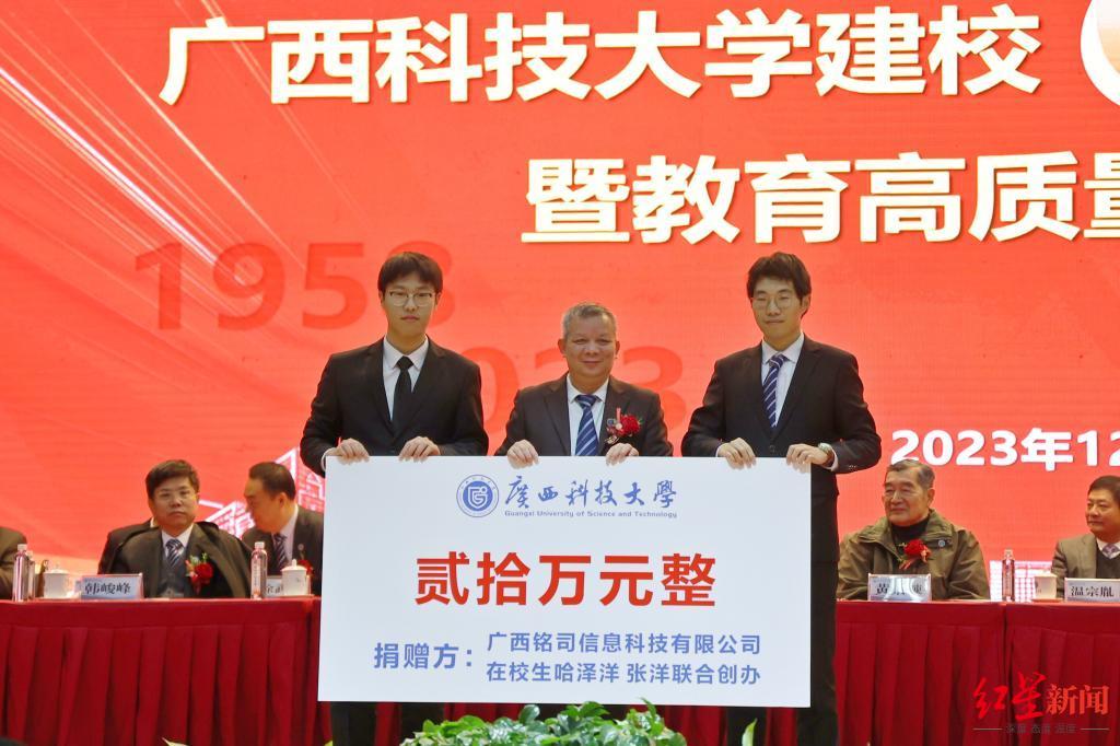 12月3日上午,广西科技大学建校65周年庆祝大会上,哈泽洋和张洋参加了正式的捐赠仪式。两个年轻人高高瘦瘦,穿着西服,系着领带,很有精神地站在校领导两边,举着捐赠20万元的牌子。