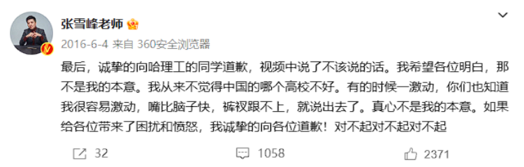“最后,诚挚的向哈理工的同学道歉,视频中说了不该说的话。我希望各位明白,那不是我的本意。我从来不觉得中国的哪个高校不好。有的时候一激动,你们也知道我很容易激动,嘴比脑子快,裤衩跟不上,就说出去了。真心不是我的本意。如果给各位带来了困扰和愤怒,我诚挚的向各位道歉!对不起对不起对不起。”