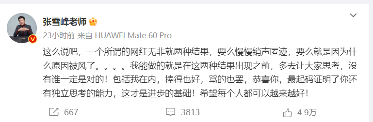 “这么说吧,一个所谓的网红无非就两种结果,要么慢慢销声匿迹,要么就是因为什么被风了......"从张雪峰最近发的这个帖子看,他自己似乎也意识到了什么。我好奇的是,网红的结局真的只有销声匿迹或被封两个吗,如果好好的做自己擅长的专业指导服务与教育辅导博主,只要市场需求在,又怎么会销声匿迹或被封呢?除非,他继续坚持这么走下去,沉浸在“网红名师”无所顾忌的表达快感里,那确实迟早要坏事。毕竟,这个社会是有规范的,对过头之处也有“防火墙”制约。
