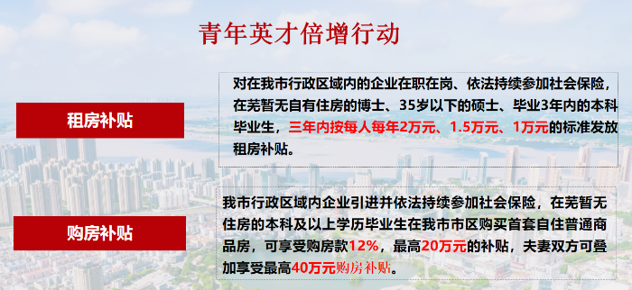 为吸引优秀人才,搭建产学研合作桥梁,该市开展青年英才倍增行动,在芜湖暂无住房的本科生落户最高可享受20万元、夫妻双方可叠加享受40万元的购房补贴。