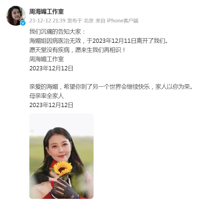 海媚姐因病医治无效,于2023年12月11日离开了我们。