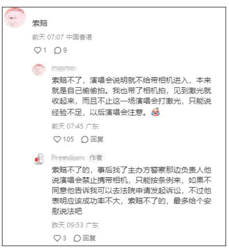 另一位观众是相机画面出现白线,导致无法正常拍摄,有网友问是不是能索赔,作者回复索赔不了,事后找了主办方警察那边负责人说演唱会禁止携带相机,只能按条例来,如果不同意可以去法院申请发起诉讼。
