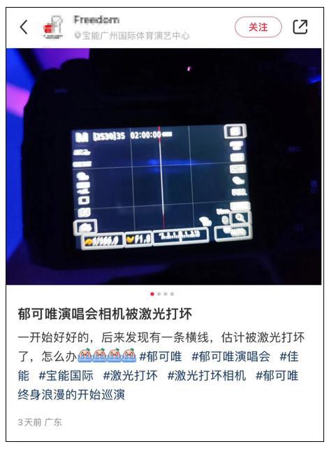 12月10日,有几位网友发帖称,观看郁可唯演唱会时,照相机的镜头被舞台激光照射受损。