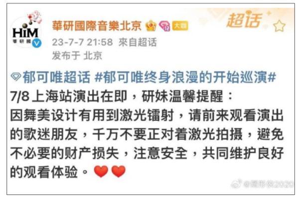 记者查询发现,关于郁可唯演唱会激光问题,其公司微博、门票上都有提到过。