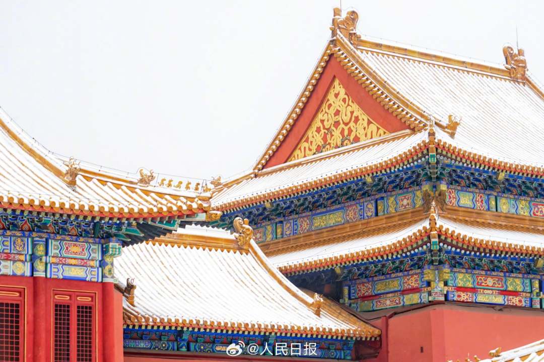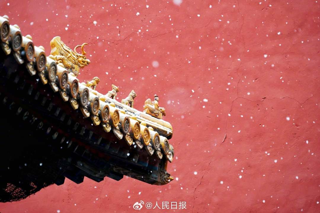 今天,北京再迎降雪。在故宫博物院,金瓦红墙,白雪纷飞,漫天白雪配上红墙,景色动人。(来源:人民日报微博)
