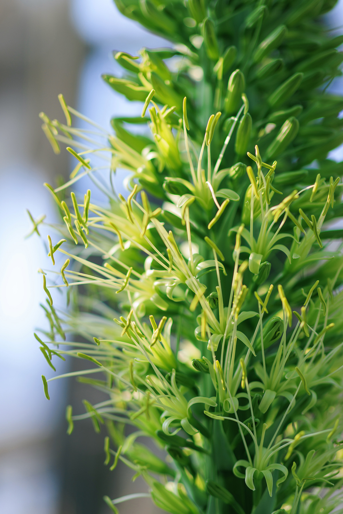 辰山植物园园艺景观部沙生植物养护专家介绍,正常情况下,蓝狐尾龙舌兰需8-10年才会开花。龙舌兰一生仅开一次花,花开即死,因为其开花需要耗费多年的养分积累,在开花过程中,肥厚的叶片会变得干瘪枯黄,将养分输送给花序以换取繁衍的希望。但也无需感伤,珠芽会在花谢之后慢慢成熟,缀在花葶之上,待时机成熟便落地生根,完成繁衍。