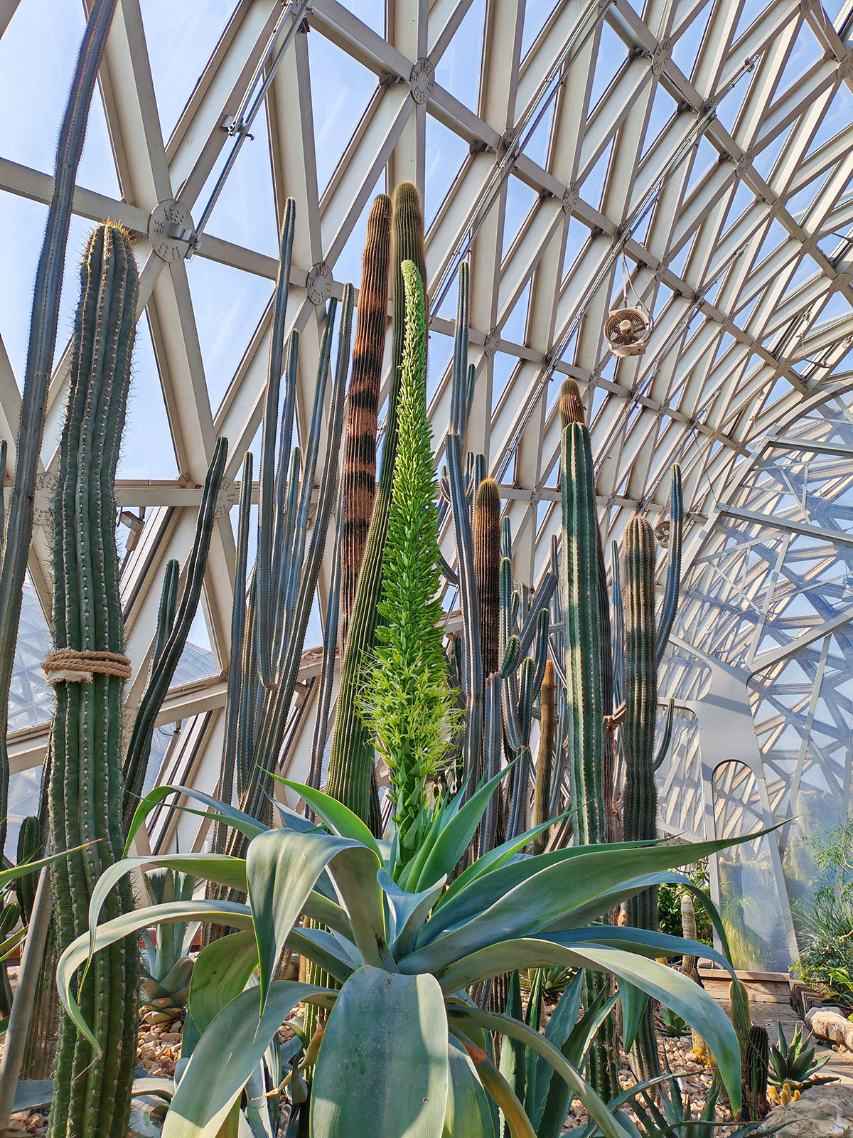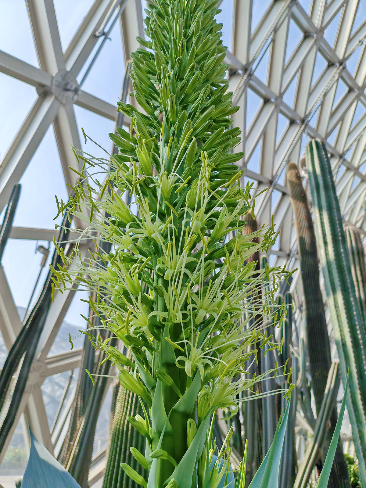 最近天气晴好,上海辰山植物园沙生植物馆(展览温室B馆)内的两株蓝狐尾龙舌兰竞相抽出花序,这是蓝狐尾龙舌兰十年来首次在辰山植物园开花。
