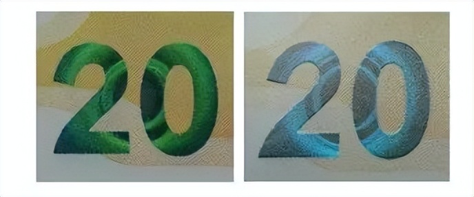位于票面正面右侧。改变观察角度,面额数字“20”的颜色在绿色和蓝色之间变化,并可见圆形光环效果。防伪特征效果见图8。