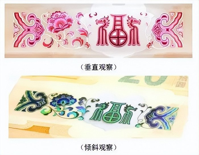 位于票面下方。改变观察角度,票面正面可见“如意云纹”、“缠枝牡丹”与“福”字组成的装饰纹样呈现多色动感特征。防伪特征效果见图6。