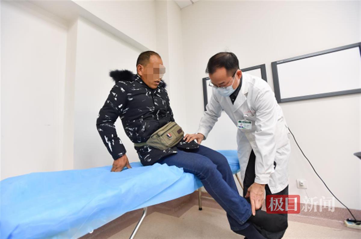 10月25日,极目新闻曾报道过膝盖受伤的农民工刘先生拄着扁担来武汉市第四医院求医,出院时用上了医院帮他申请的免费拐杖。12月14日,刘先生如约复诊,笑着说:“拐杖比扁担好用多了。”