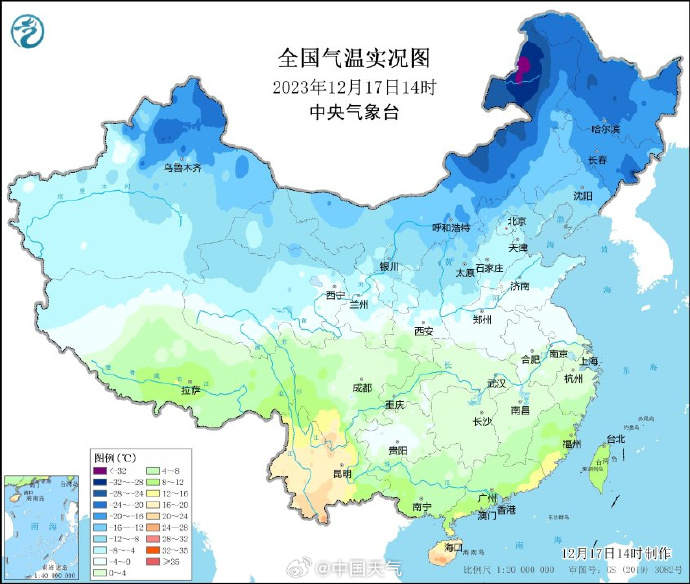 今天(12月17日)下午气温实况图上,南方大部冻得一片苍白,除了云南气温还有点暖乎颜色,其他大部地区基本都接近冰点,即使华南气温也普遍都是个位数。对比看,14时左右拉萨都有14.9℃,广州却只有8.1℃ ,南宁只有4.4℃,真的冷麻了,寒潮之下的南方人真的得靠羽绒服救命了!