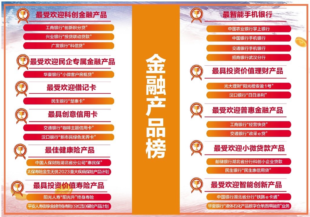 比如农业银行湖北省分行的养老金融产品、中国银行湖北省分行的“铁路e卡通”、邮储银行湖北省分行的“科创小企业贷款”、华夏银行武汉分行的“小微客户房抵贷”、兴业银行武汉分行的“投贷联动贷款”、中国光大银行武汉分行的“阳光橙安盈1号”、汉口银行的“新市民贷”、阳光人寿湖北分公司“阳光升”终身寿险等。