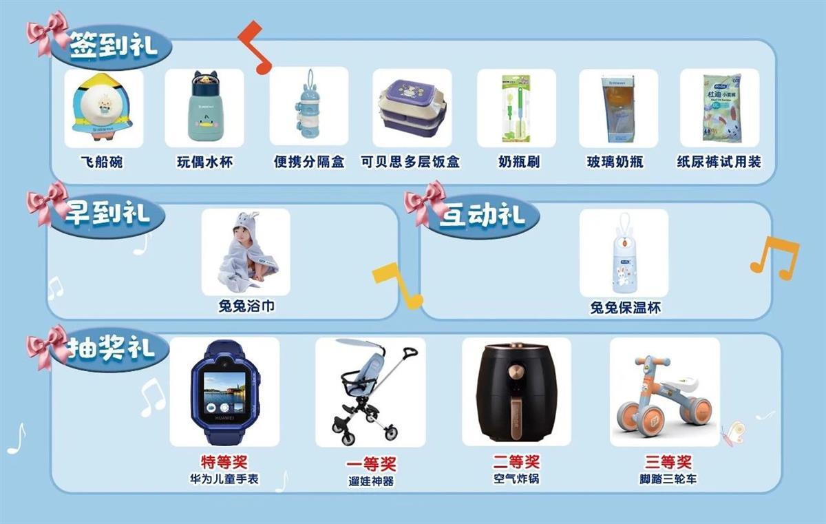 参加本次音乐会,不仅可以签到领取飞船碗、玩偶水杯等礼品,早到和参与互动也均有精美礼品相送,音乐会期间还将随机抽取多位孕妈妈,送上儿童手表等抽奖礼。