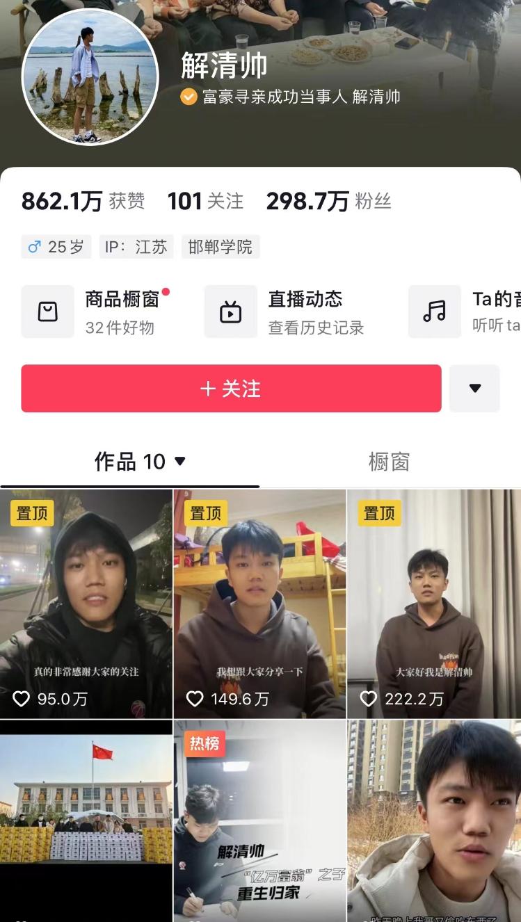 海报新闻记者发现,直播当日,解清帅的妈妈、妹妹、哥哥和嫂子也现身直播间,直播间观看人数达10w+。直播期间,解清帅账号粉丝量为289w。截至记者发稿,解清帅抖音账号粉丝量为298.7w。