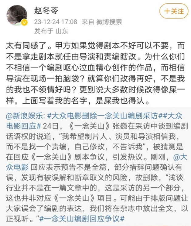 且不说张巍在采访中谈及的编剧话语权说的到底是不是《一念关山》这个项目,但这番话确确实实引起了相当多业内编剧的共鸣和支持。《警察荣誉》编剧赵冬苓、《猎罪图鉴》编剧贾东岩 、导演高群书、编剧柳桦、编剧崔健、《芈月传》作者蒋胜男均转发微博支持张巍。赵冬苓直言“甲方如果觉得剧本不好可以不要,而不是拿走剧本就任由导演和责编瞎改……就算你们改得再好,不是我的我也不领情好吗?”张巍和一众编剧们的发声支持也切中了确实存在的问题,编剧话语权不足,被魔改剧情狠狠伤到的观众转过来骂编剧在胡编乱造,殊不知这剧情已经不知道倒了多少手了,最终的呈现编剧也无能为力。