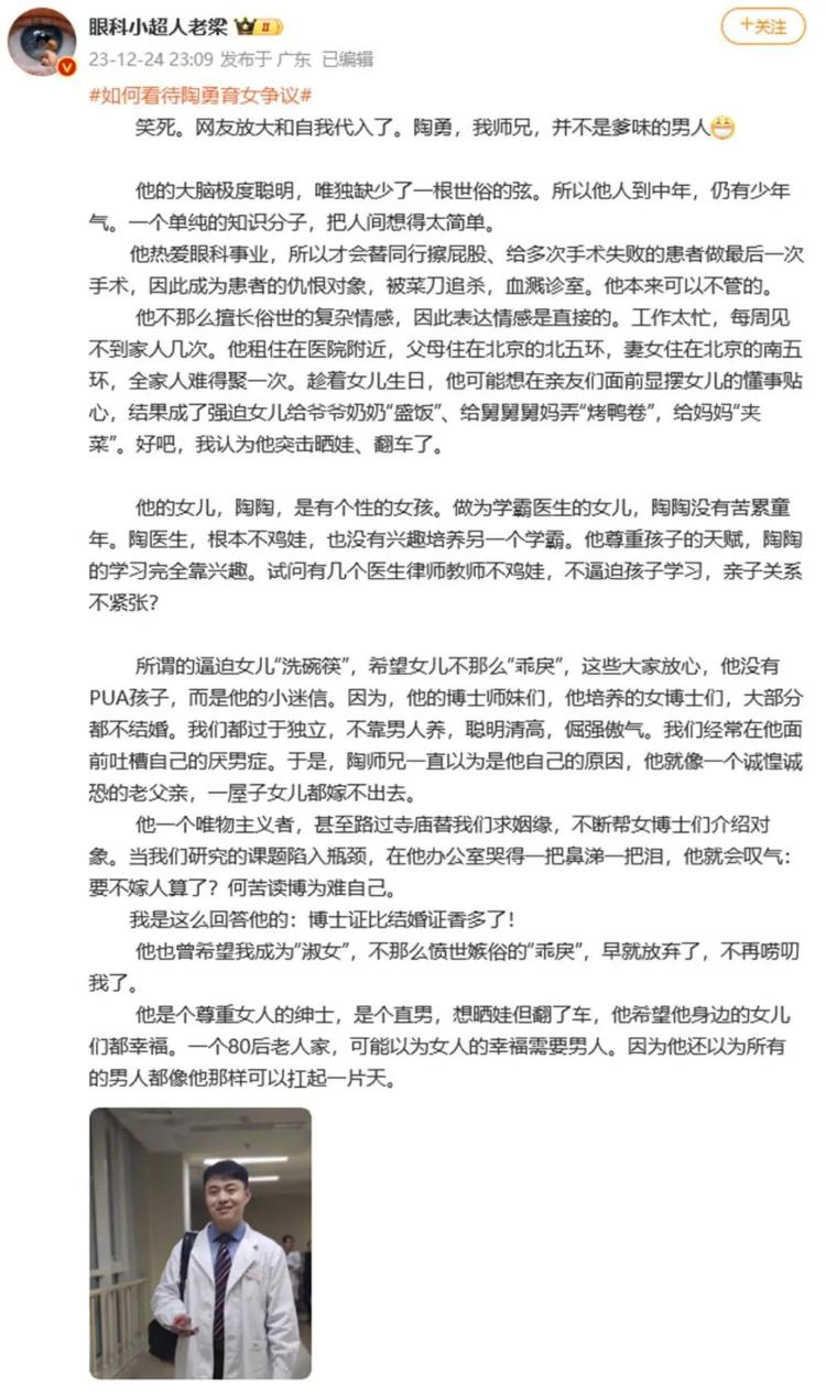 12月24日深夜,拥有超330万粉丝的医生大V“眼科小超人老梁”发长文力挺陶勇,称他是自己的师兄,并不是爹味的男人。她提到:陶医生的工作很忙,每周见不到家人几次,可能是想在亲友面前显摆女儿的懂事贴心,结果成为了“强迫”。