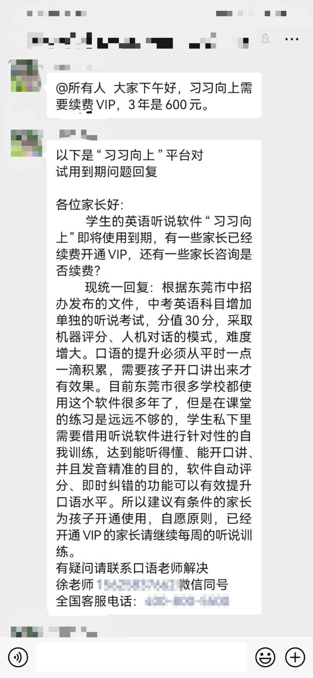 网传聊天记录显示,有人在群聊内发消息解释英语听说软件“习习向上”的续费问题,办理3年VIP需600元。其称“中考英语科目增加单独的听说考试……学生私下里需要借用听说软件进行针对性的自我训练……所以建议有条件的家长为孩子开通使用,自愿原则,已经开通VIP的家长请继续每周的听说训练。”