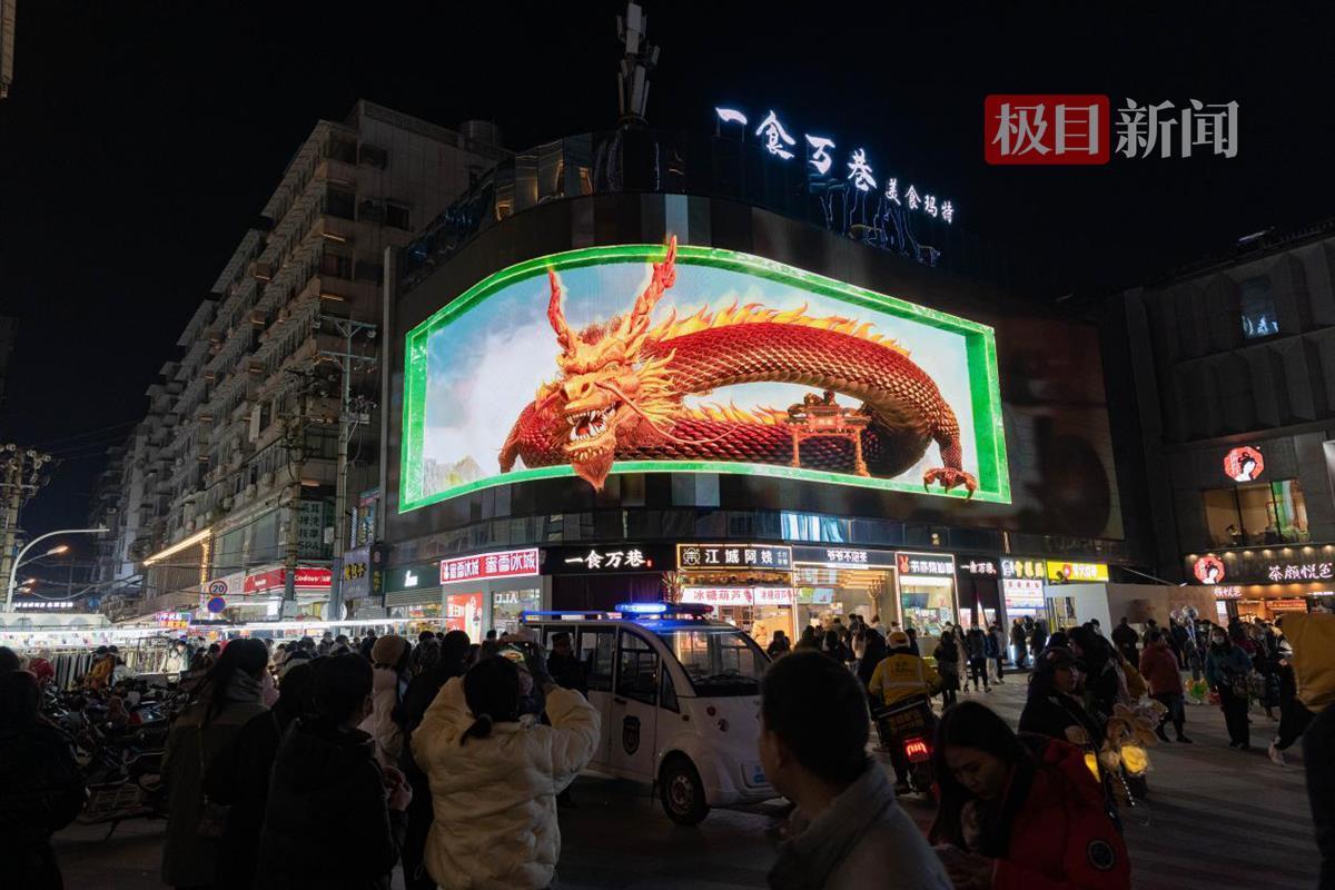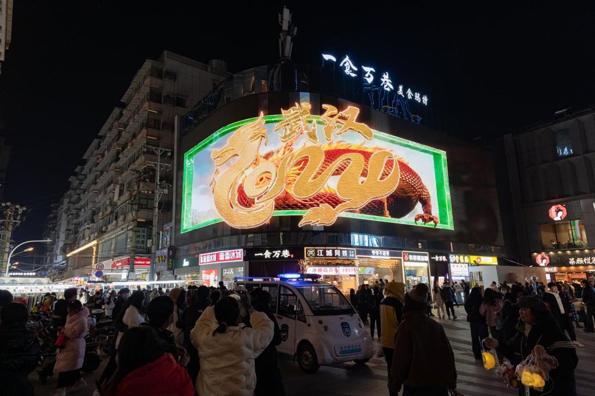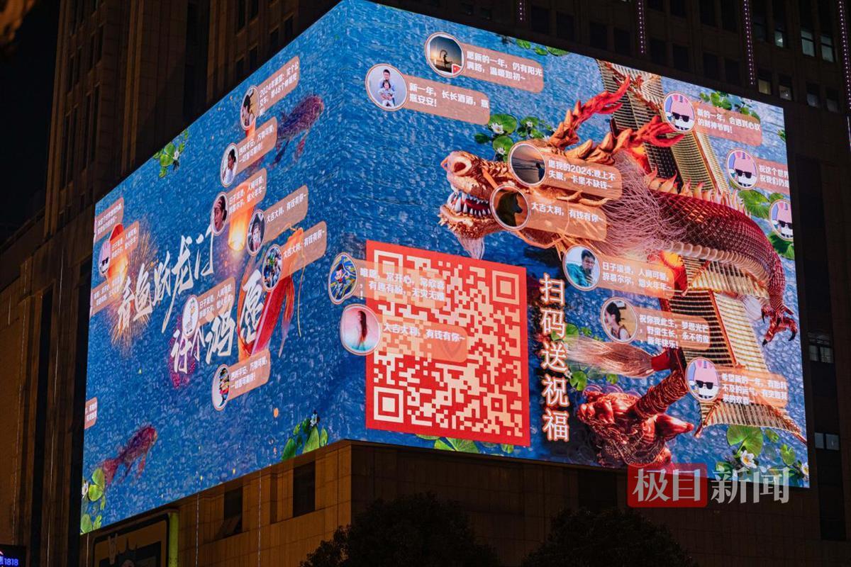 一直以来,龙的传说深深扎根于中国人心中,成为福运的象征。武汉的夜空被裸眼3D大屏点亮,在这个特别的暖心时刻,见证震撼的瞬间——鲤鱼跃龙门。在裸眼3D炫酷技术的呈现下,这条栩栩如生的巨龙,仿佛要破屏而出,给人一种强烈的视觉冲击。望龙见喜,祝愿新年欣欣向荣,扶摇直上,步步高升,让人满怀期待!现场观众纷纷拿出手机,扫码祈福,记录下这激动人心的时刻。