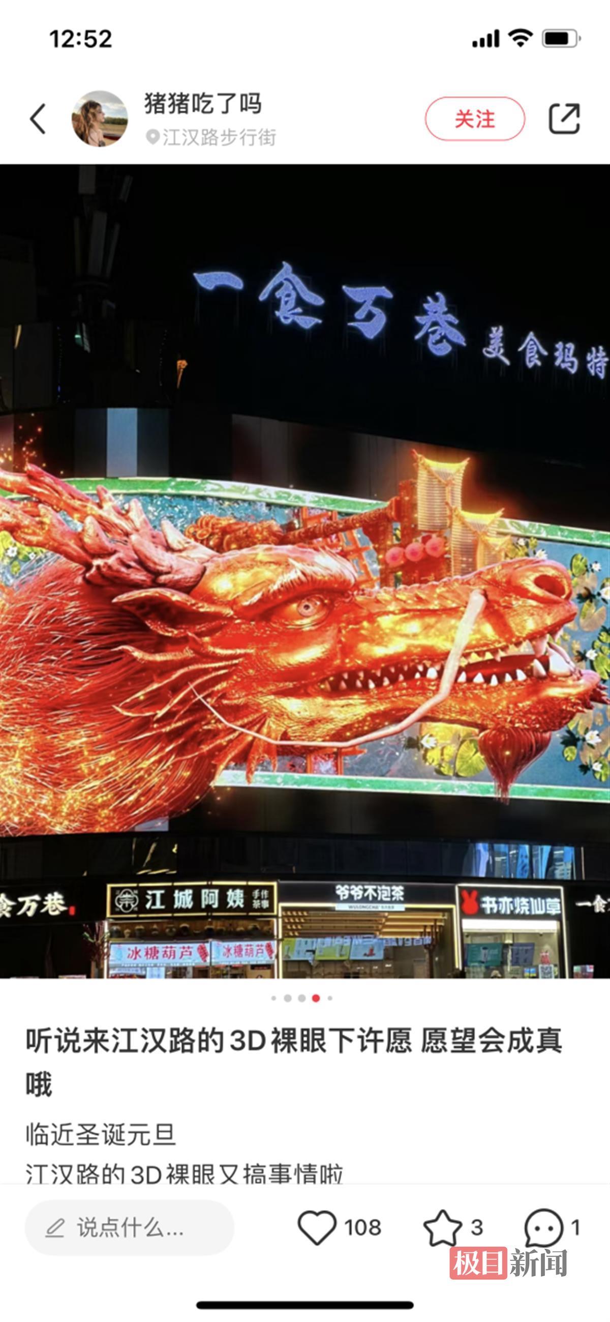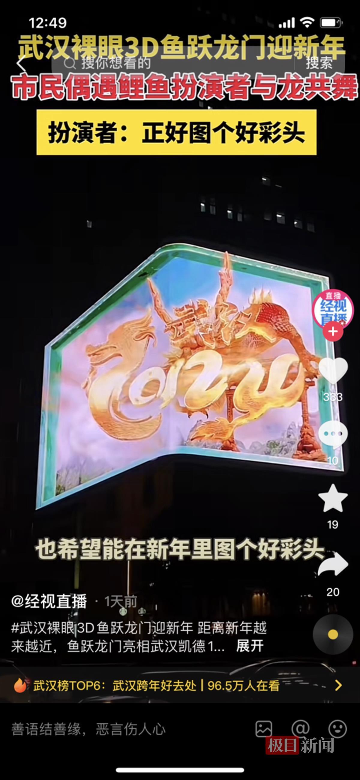 武汉人的跨年狂欢又有新玩法!最近,江汉路和楚河汉街裸眼3D大屏上演了武汉版鱼跃龙门,福气祥龙跃然而出,宛如天降祥瑞一般,超级震撼!