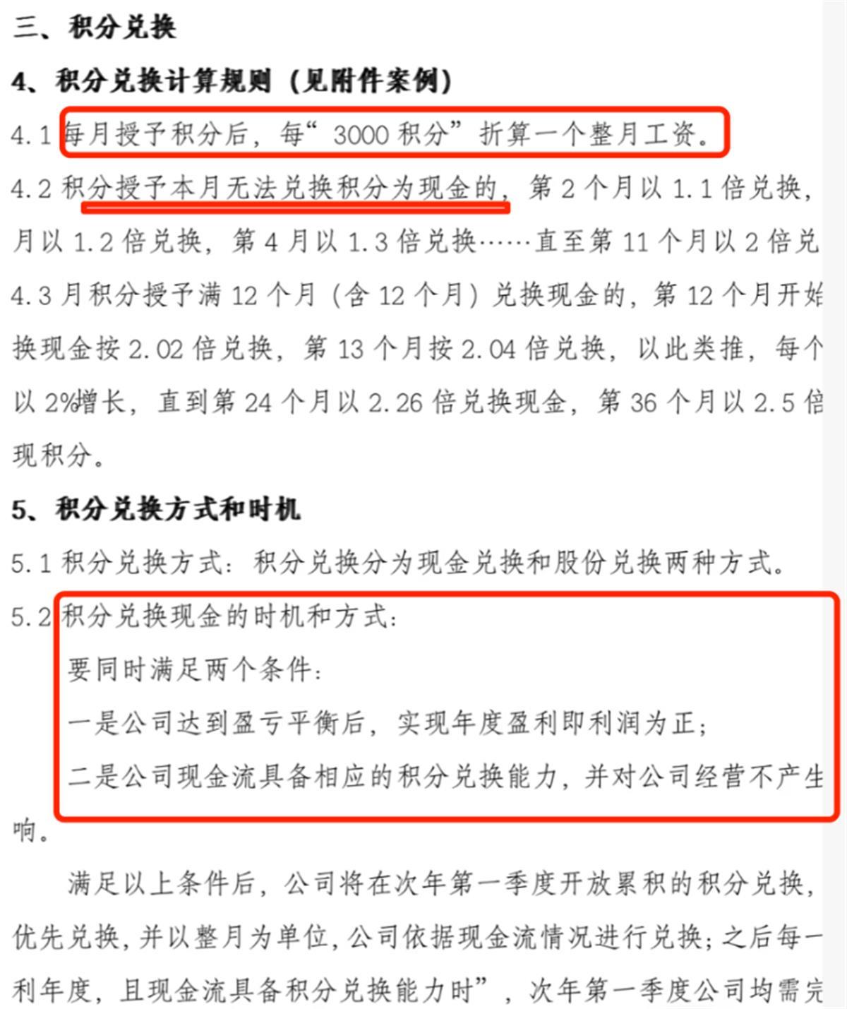 12月26日,有网传消息称,江苏苏州吴江区一家企业授予员工积分折算工资,待融资到位后补发工资。网传信息显示,该企业的《公司积分制度》称,“创业团队或公司授予所有专职或兼职参与公司发展或帮助公司发展的公司员工,或外部协助人积分。全职参与公司事务,按日授予100积分。每月授予积分后,每‘3000积分’折算一个整月工资。积分授予本月无法兑换积分为现金的,第2个月以1.1倍兑换,第3个月以1.2倍兑换,第4月以1.3倍兑换……直至第11个月以2倍兑换。”积分兑换现金必须同时满足两个条件:“一是公司达到盈亏平衡后,实现年度盈利即利润为正;二是公司现金流具备相应的积分兑换能力,并对公司经营不产生重大影响。”