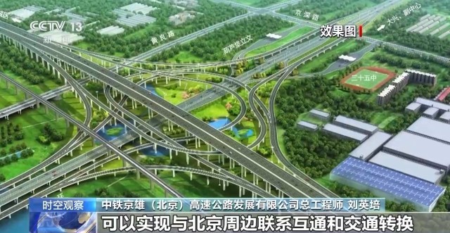 中铁京雄(北京)高速公路发展有限公司总工程师刘英培:六环路立交设置全互通匝道8条,可以实现与北京周边联系互通和交通转换。同时,还可利用六环路向平行高速——京开高速、京台高速、京港澳高速等进行分流。