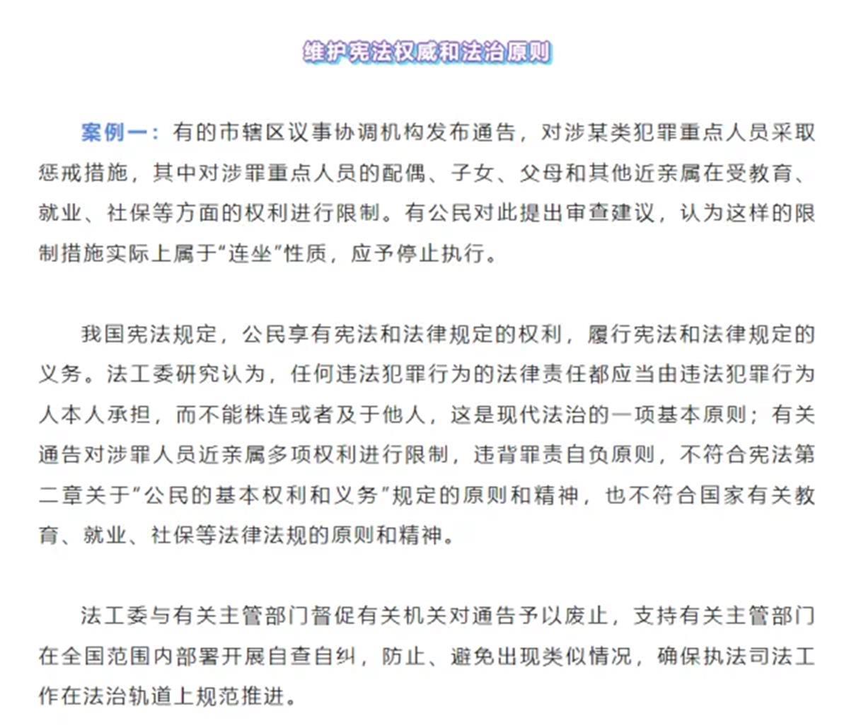报告介绍,有的市辖区议事协调机构发布通告,对涉某类犯罪重点人员采取惩戒措施,其中对涉罪重点人员的配偶、子女、父母和其他近亲属在受教育、就业、社保等方面的权利进行限制。有公民对此提出审查建议,应予停止执行。