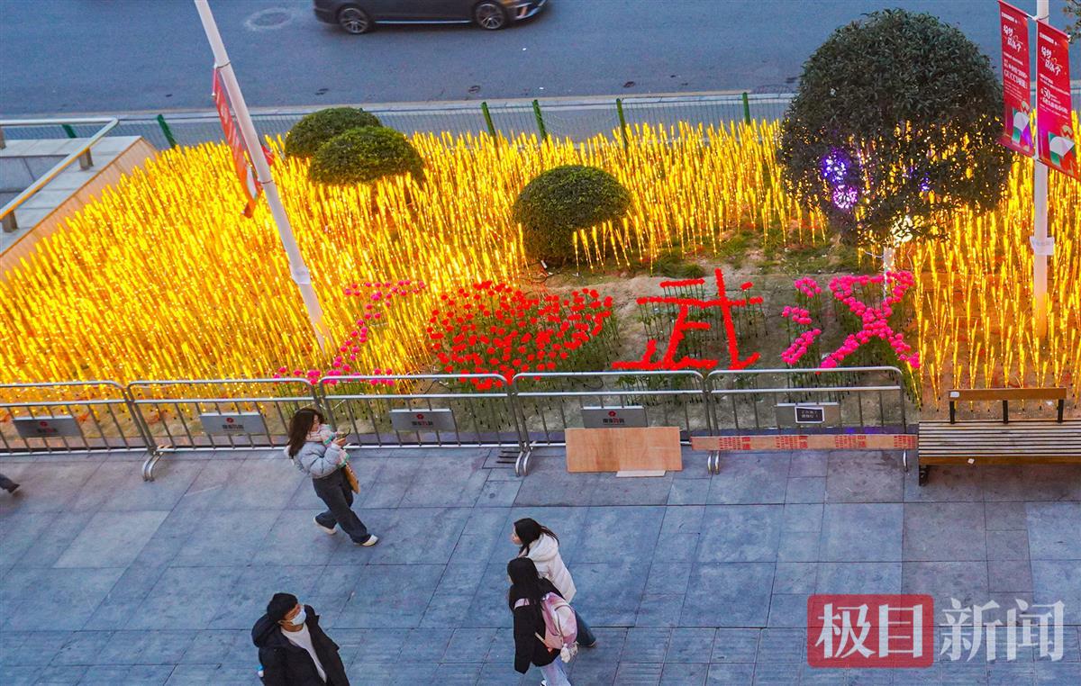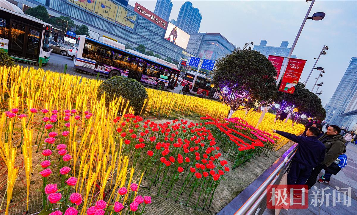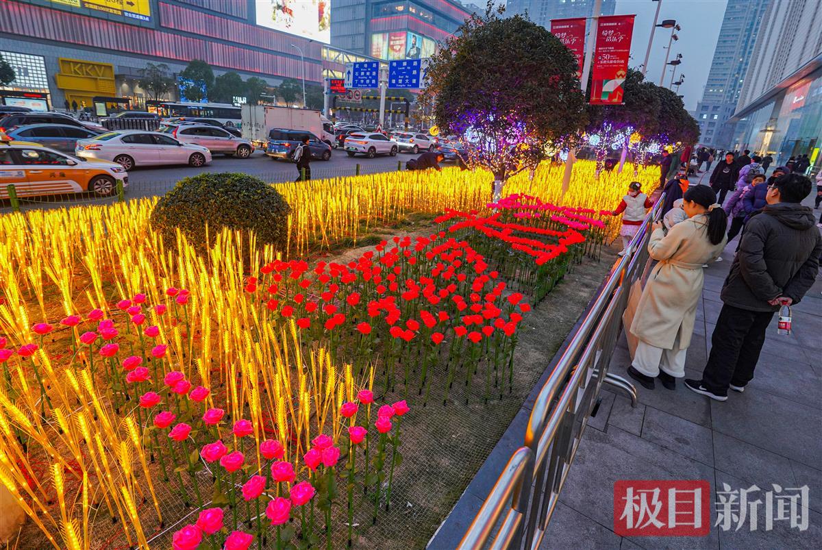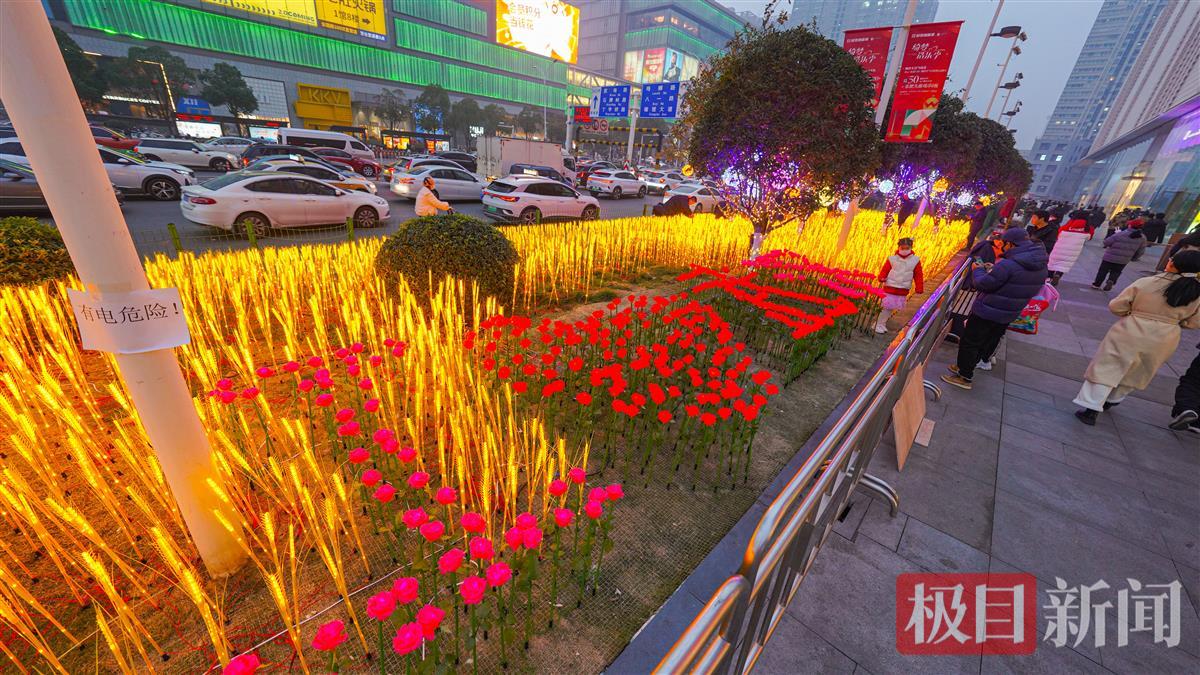 金色“麦田”是以众多的麦穗灯组成,簇拥着以玫瑰花灯组成的“我爱武汉”图案,与树干上的黄色和暖白色星星灯交相辉映,让人感受到新年新气象、福气满满的幸福感。