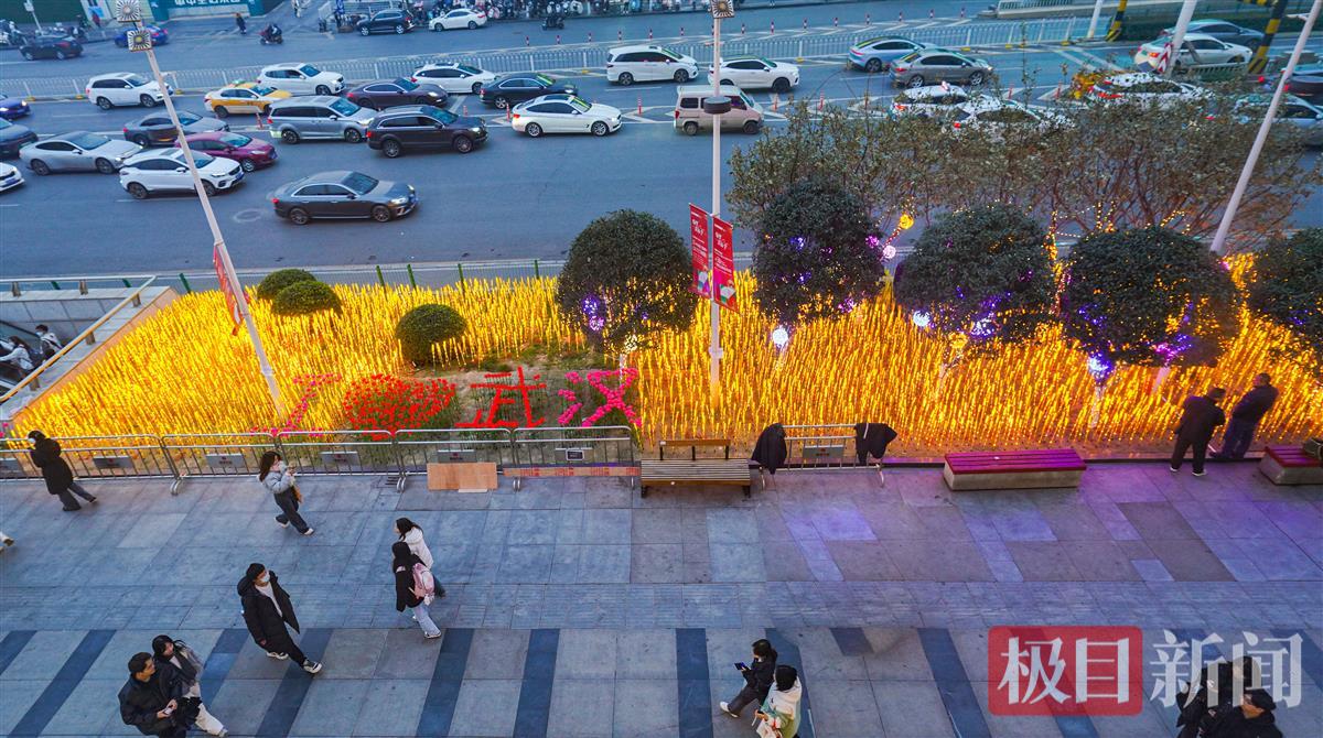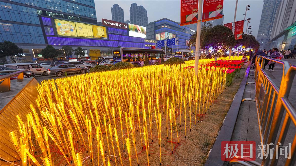 元旦佳节,欢乐的气氛铺满了武汉大街小巷。2023年12月31日,夜幕降临,武昌街道口武珞路东侧的金色“麦田”,呈现绚烂夺目的光彩照亮夜空。