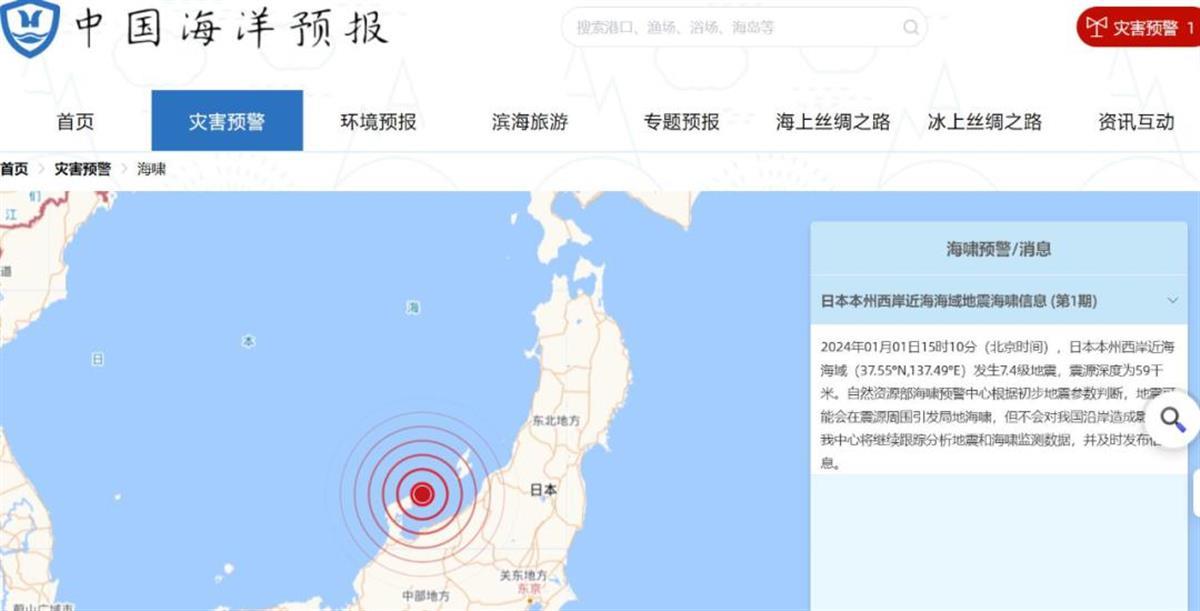 与此同时,我国自然资源部海啸预警中心也发布了海啸预警称,1月1日15时10分(北京时间),日本本州西岸近海海域发生7.4级地震,震源深度为59千米。自然资源部海啸预警中心根据初步地震参数判断,地震可能会在震源周围引发局地海啸,但不会对我国沿岸造成影响。自然资源部海啸预警中心将继续跟踪分析地震和海啸监测数据,并及时发布信息。
