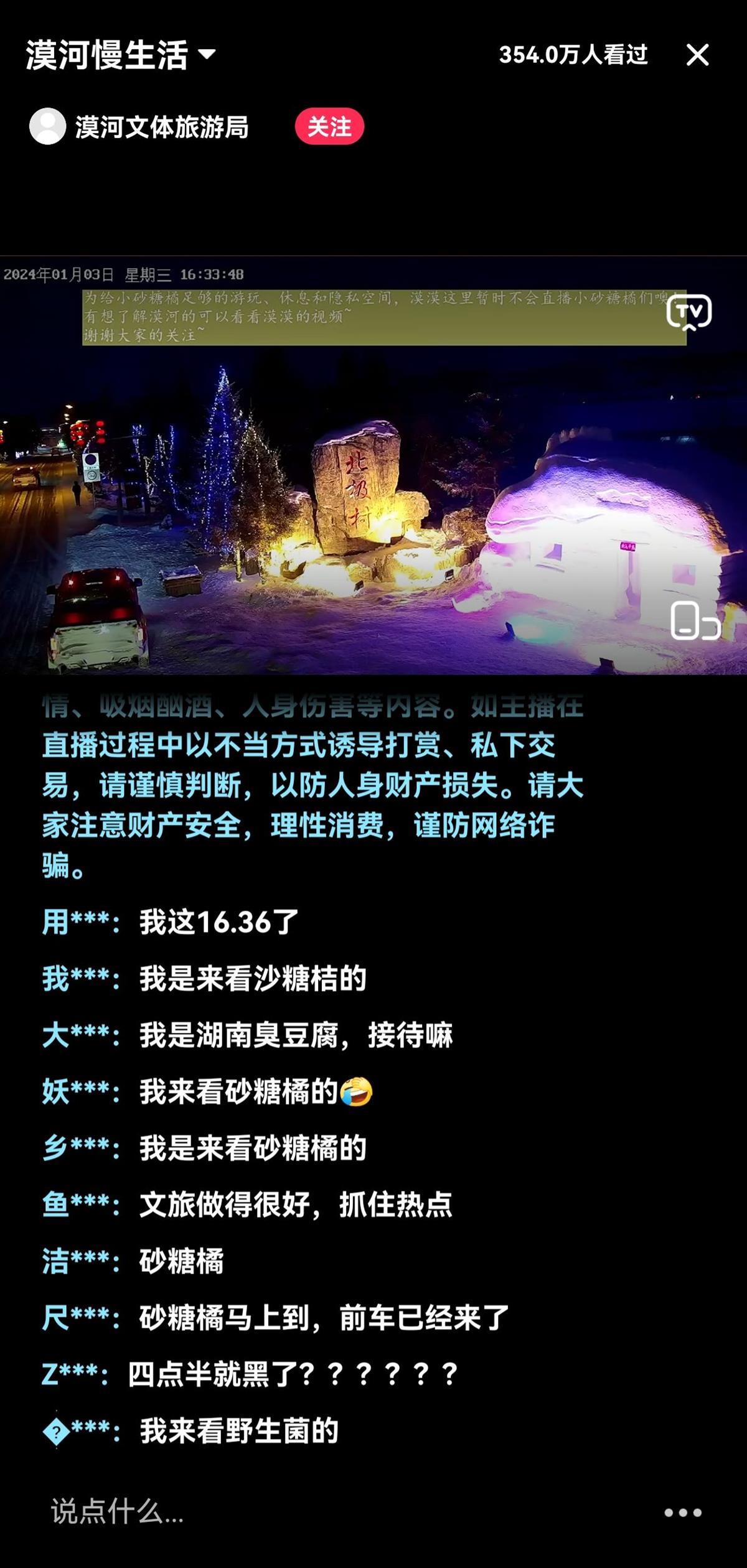 极目新闻记者注意到,1月3日,“漠河文旅”发布连续多条视频,视频配文写道,“请网友放心,广西11个小砂糖橘安全全部接到。”“大家放心吧,漠河文旅全程保驾护航。”“小编也在努力更新,大家别急,大家可以数一数小砂糖橘们少没少,请家人们放心。”在漠河文旅局开启的漠河慢生活直播间,数据显示超340万人看过直播,“小砂糖橘呢”等评论刷屏评论区。“为给小砂糖橘足够的游玩、休息和隐私空间,漠漠这里暂时不会直播小砂糖橘们……”直播画面这样写道。