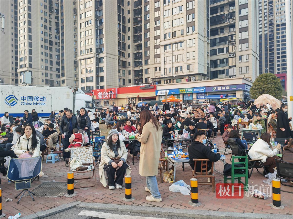 距天空剧场还有500米的道路两侧,开阔地上已坐满了提前占位赏烟花的游客,附近的商家开展了租借桌椅凳子的服务,而各种小吃摊贩也早已开始了全负荷运转,每一个摊位前都能看到排队的游客。