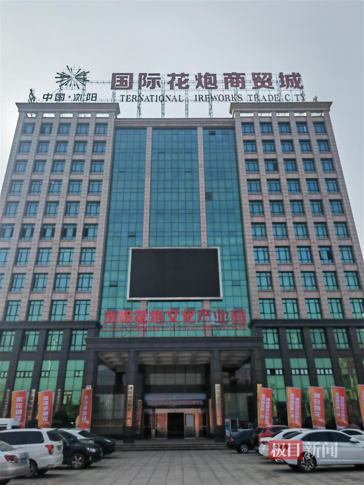 1月1日下午,极目新闻记者前往位于浏阳市大瑶镇迎宾大道的国际花炮商贸城,道路两侧不时可见花炮工厂,还有各种花炮产品的广告牌。国际花炮商贸城正门是一栋12层高的楼房,大楼的两侧和后侧,则是商户林立的花炮商业街。