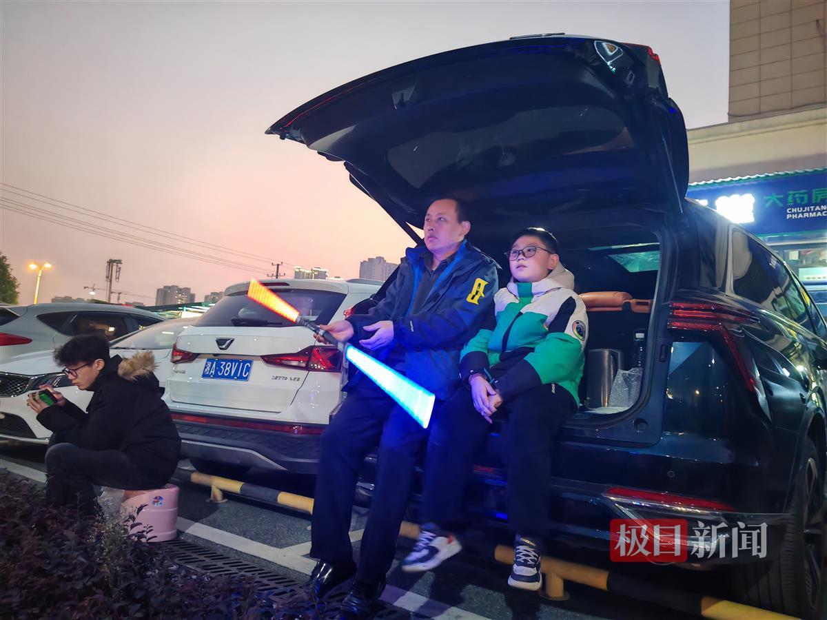 为了能够占据好的观赏位置,长沙市民孙先生中午就将越野车停在路口处一商户的停车位上,将后备箱正对着天空剧院方向。晚7时30分许,他和儿子坐在打开的后备厢里,手持荧光棒,静待着烟花秀的开始。