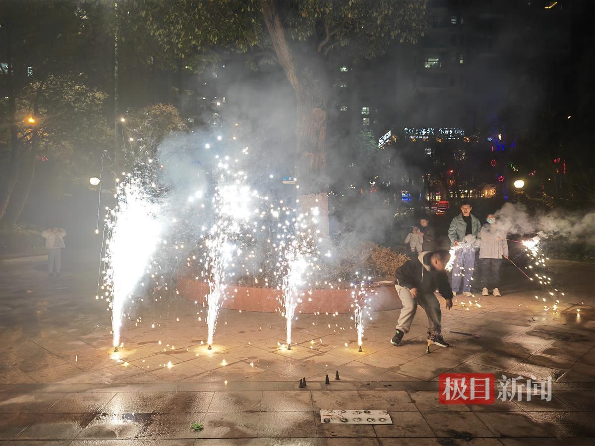 极目新闻记者在现场看到,在天空剧院外的开阔地带,有的游客已经自行放起了加特林烟花,钻天猴、高空水母等小型烟花也不时升空,还有小朋友挥动着手中的仙女棒,附近商户的烟花很快就销售一空。