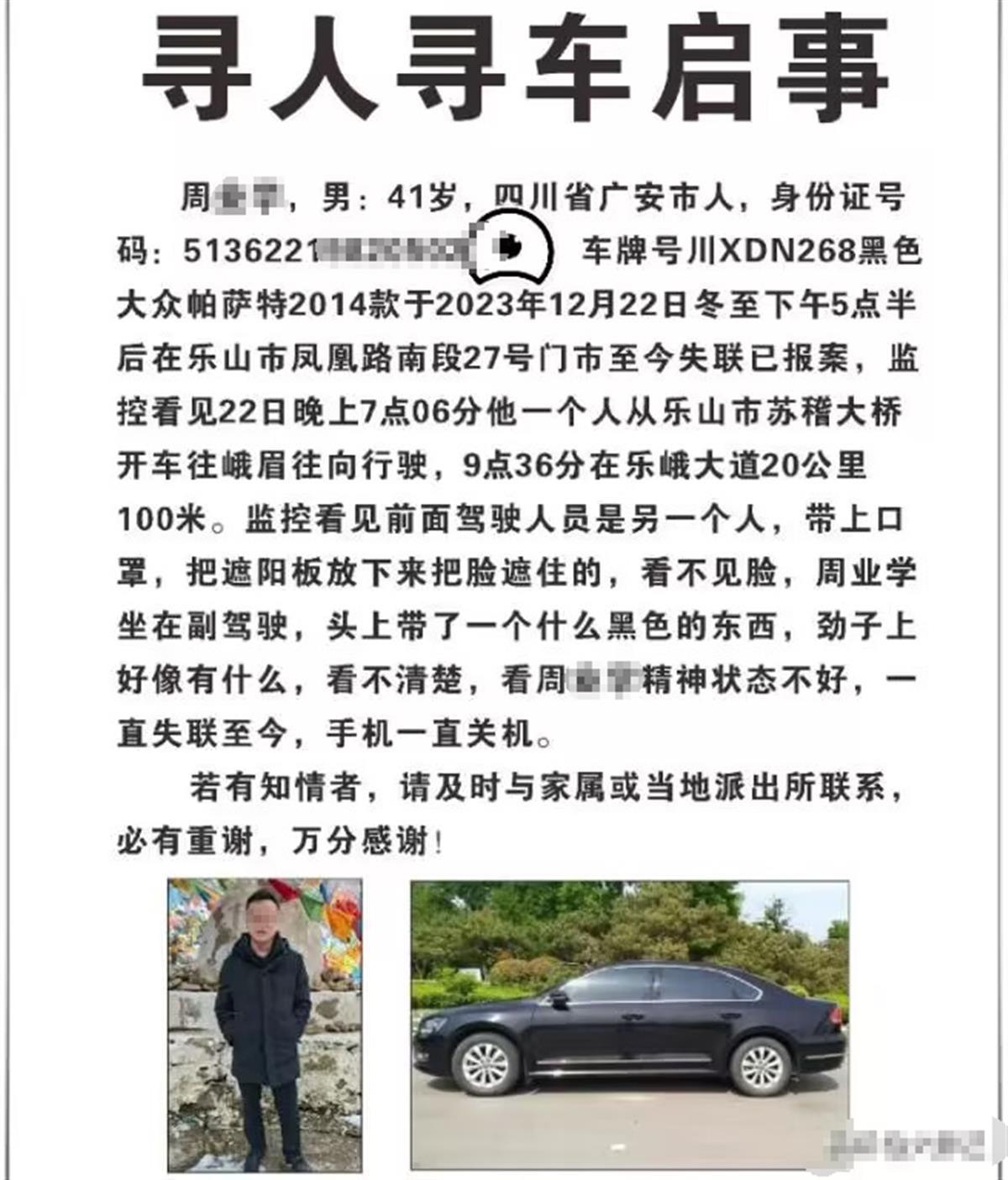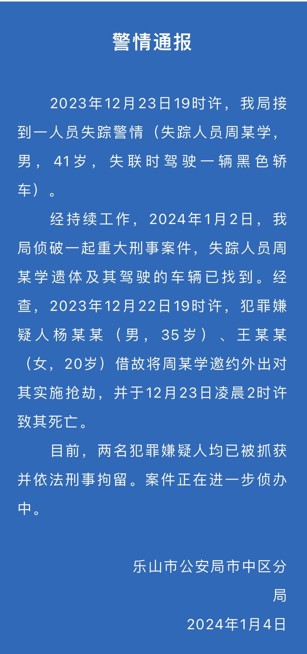 2024年1月4日,四川乐山市公安局市中区分局发布警情通报,称2023年12月22日失联男子(周某学,男,41岁,失联时驾驶一辆黑色轿车)遗体及其驾驶的车辆,已于1月2日找到。目前,两名犯罪嫌疑人均已被抓获并依法刑事拘留。案件正在进一步侦办中。
