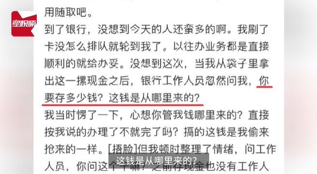 据相关话题内容显示,江西一女子在社交平台上发文称,其将10万元现金去银行办理存款时,被银行工作人员询问现金来源。对于该问题,工作人员称,这是银行的规定,当客户存款金额超过10000元现金时,就要问清楚钱的来源。