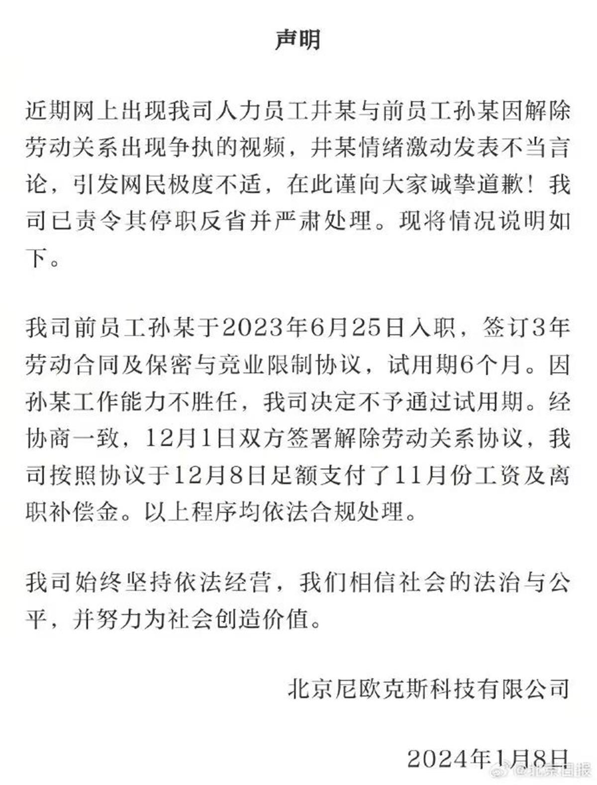 一段网传视频显示,拍摄者质疑公司存在违法解除劳动合同的行为,一名女子叫嚣:“我现在就违法解除,我违法你管得着吗?我就是违法解除,你去告我吧!”该视频引发网友关注。随后,涉事北京尼欧克斯科技有限公司发布声明称,该公司人力员工井某情绪激动发表不当言论,公司已责令其停职反省。