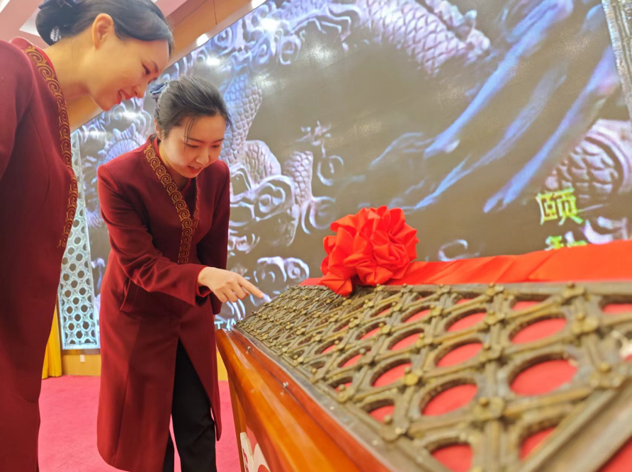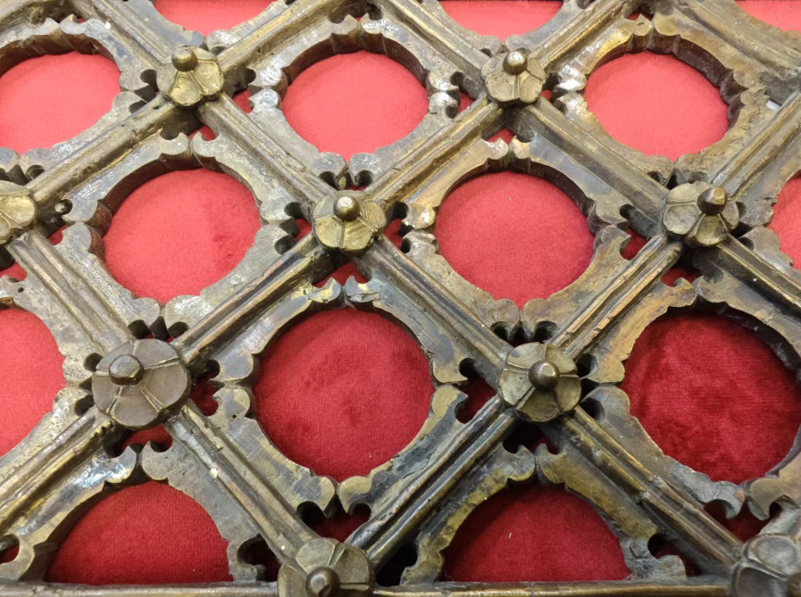 本次回归的铜窗芯长105.2厘米、宽19.8厘米,为双交四椀式菱花隔扇。在捐赠现场,铜窗芯保存于定制的红丝绒匣内,安静地陈列在主会场中央,在灯光映衬下,焕发出幽幽的金属光泽。